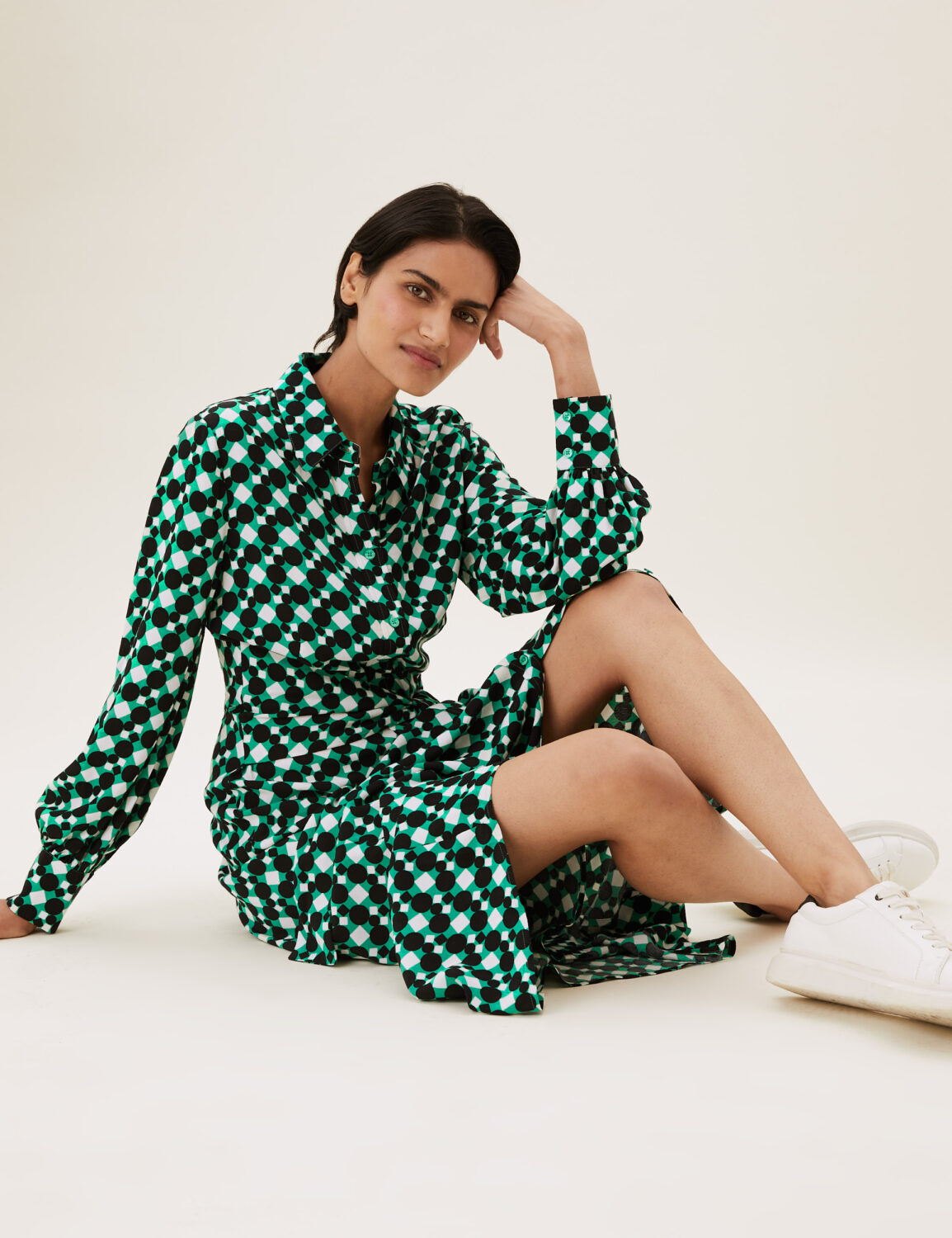 This midaxi geometric print dress will have you covered for both smart and casual occasions this season. This shirt style is cut in an easy regular fit, with a waist-cinching belt and a flowy tiered skirt: