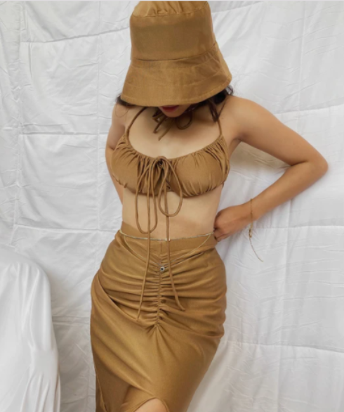 If you are more of a conservative type and not into daring swimwear bottoms, Helen Piece is for you. This line has lovely printed bikini tops paired with matching skirts or shorts in wonderful prints, too. You definitely have your style game on-point as some ensembles have matching bucket hats, which coordinate so well with your swim outfits. So cute!