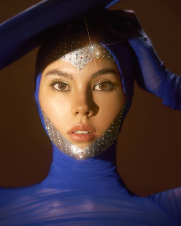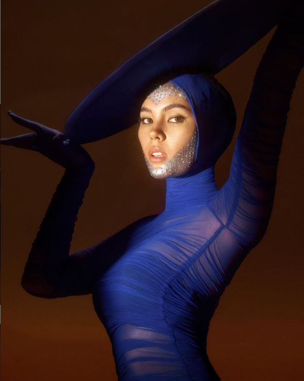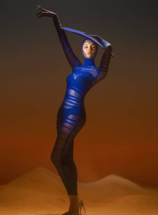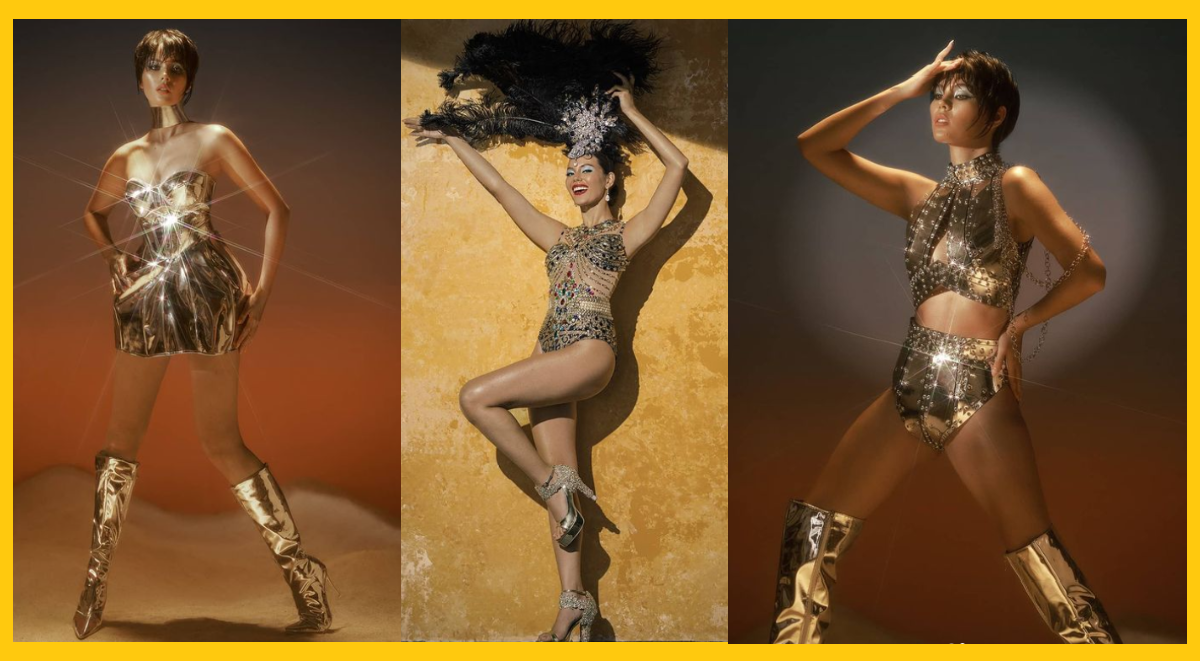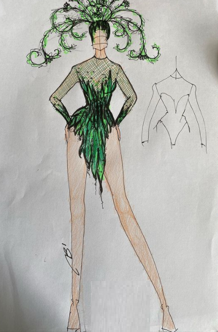 The following is such a full-on Colombian showgirl vibe. It’s festive and still so fierce! The bodysuit and  headpiece were created by Dennis Celestial:
