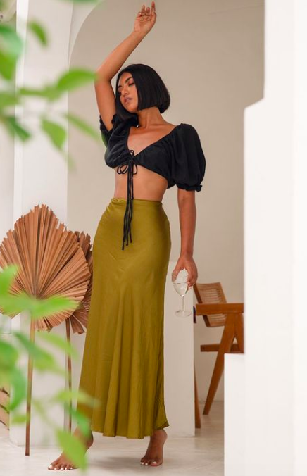 If you want to lounge in style, you can cop Ressham’s effortless look right here. Get your crop top and pair it with a flowy high-waisted maxi skirt to nail style and comfort in one look.