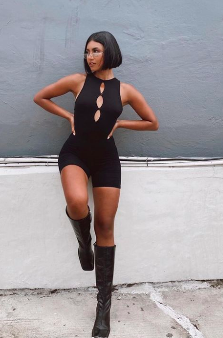 This outfit spells out sexy and fierce at any angle. In here, Resham is sporting a sleeveless onesie with chest cut-outs with a pair of knee-length boots. Before we forget, we also love her Y2k glasses!