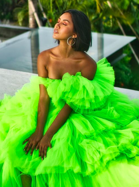 Bring out that daring dresser in you and try a neon tulle dress for a spin even for the IG. Resham looks like a vision in this frilly shoulder-baring neon couture right here. It bangs so hard!