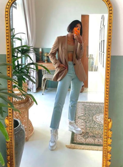 Be the queen of cool like Resham with a bralette, a pair of high-waisted light denim, and platform sneakers. Throw on a beige blazer if you want some minimal cover-up.