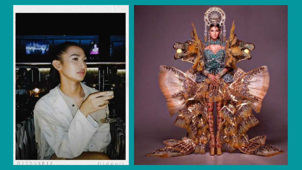 The beauty queen truly slayed the Universe stage with Que’s fashion interpretation of the Visayan mythical creature, the Bakunawa- – only this time with even more outlandish, more intricate shimmering details embellished onto the turquoise costume. With more elaborate golden accents such as creature-like sleeves depicting the folklore sea serpent in its superlative phase, the designer described her elevated Universe natcos as the “Bakunawa in its final form: the golden lunar dragon.”