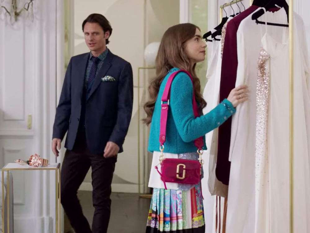 How cute is this scene when Emily met Mathieu Cadault, heir of Pierre Cadault’s brand. Pierre Cadault’s head of business affairs Mathieu mistakes Emily for American actress Brooklyn Clark. Of course, she sweetened up her eyecandy of an outfit even more with this hot pink sling bag from Marc Jacobs called Jelly Snapshot Bag.
