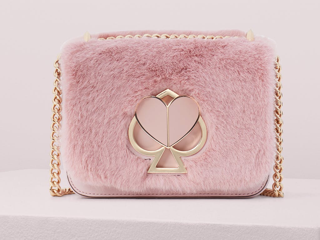 The Nicola Faux Fur Twistlock Small Convertible Chain Shoulder Bag by Kate Spade is such a cutie with its faux fur material and muted pink color.