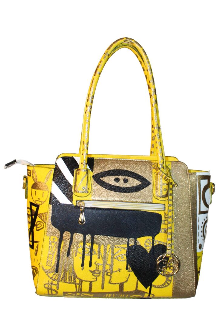 This Faux Leather Hand bag by Patricia Field was hand-painted by Jody Morlock, and embeliished with accents of gold glitter. You may check this out at www.patriciafield.com.