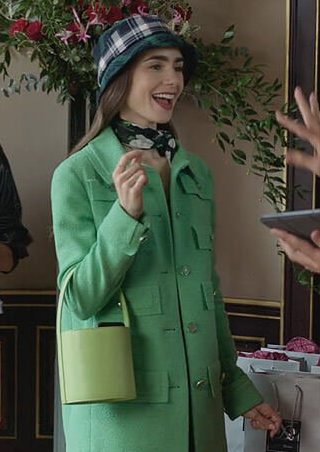 Emily embraced her influencer persona in this enviable green outfit. The real cute thang tho is the little bucket bag from Staud.
