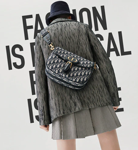 The new bag collection by Maria Grazia Chiuri features an assortment of textures and materials like calfskin. The selection also highlights the classic blue Dior oblique canvas, all shaped in half-moon body bags on top of CD logo clasp on the front leather flap.