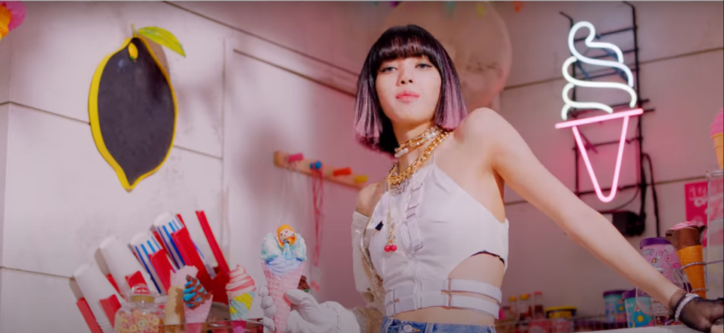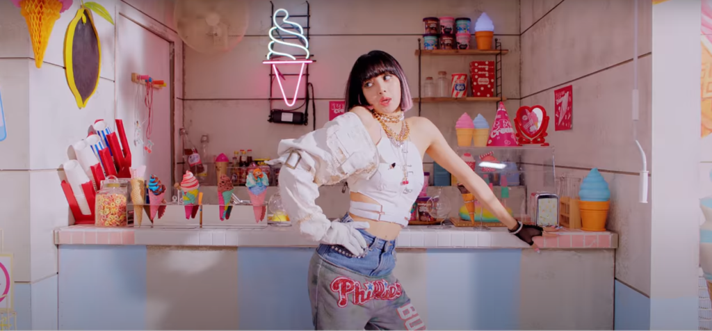 Lisa’s first fashion moment in the video is this ensemble. And it is definitely not your typical denim jeans + top combo,  I mean, just look at that edgy one sleeve number. In the words of Lisa in this song, “In the jeans like Billie, you be poppin’ like a wheelie!”This detailed white top complements her toned bod. And how interesting is that ice cream in a cone that she’s holding? Lol!