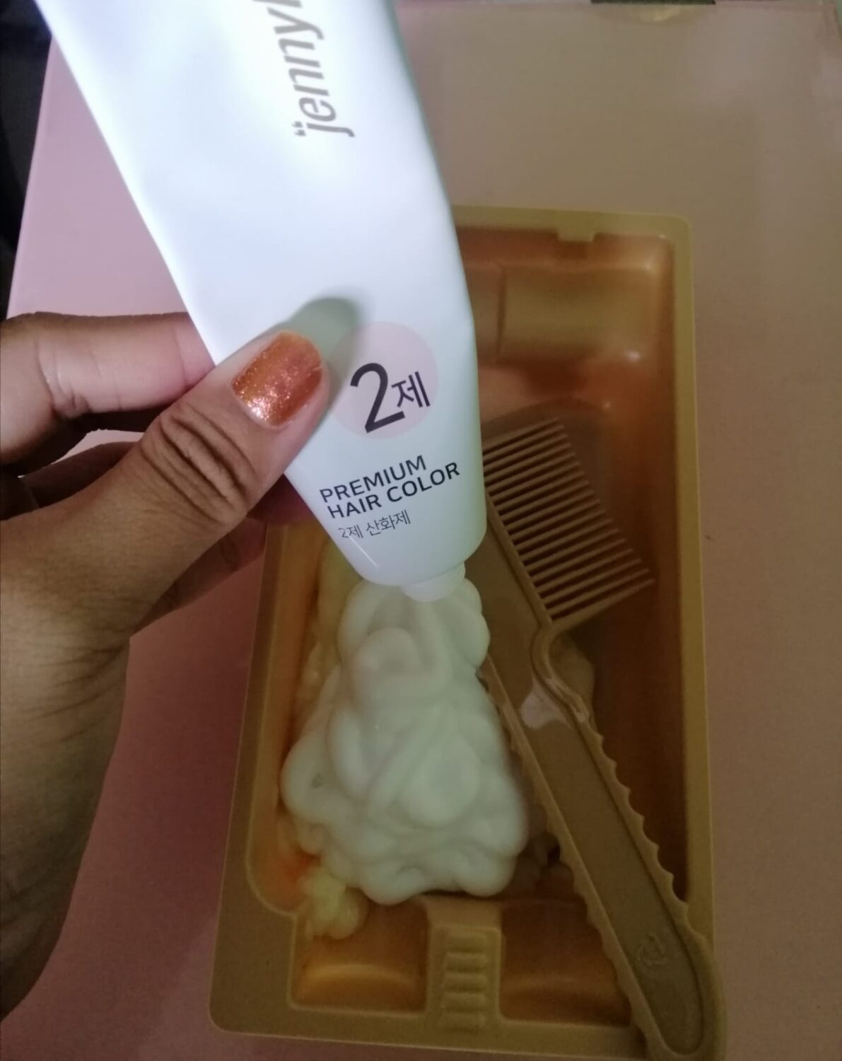 So after mixing both two tubes of color ingredients, I applied them on my hair and let it sit for 35 minutes. I loved that it did not have a strong scent, nor a strong sting on my scalp or skin while waiting. I could tell they’re really made of natural ingredients because they felt gentle and light on my hair and scalp. When I looked up on the net, Jennyhouse Premium Hair Color Kit actually has Centella Asiatica Extract that soothes the scalp and hair, which can also lessen hair damage. It also has Olive Oil so it doesn’t stain, plus Hydrokeratin that provides coating and the nutrition the hair needs. It also has Galactomyces Ferment Filtrate that recovers damaged hair and provides a shining conditioning effect.