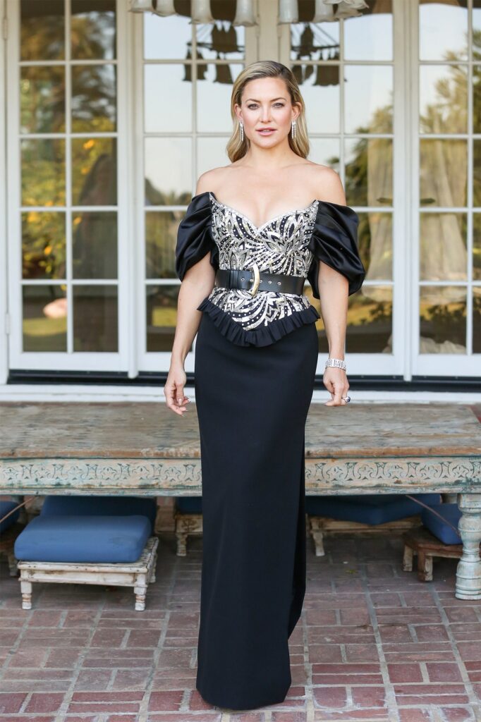 Kate Hudson, who is nominated for best actress in a motion picture comedy or musical for her role in Sia’s controversial film Music, wears a Louis Vuitton gown with jewels by Bulgari: