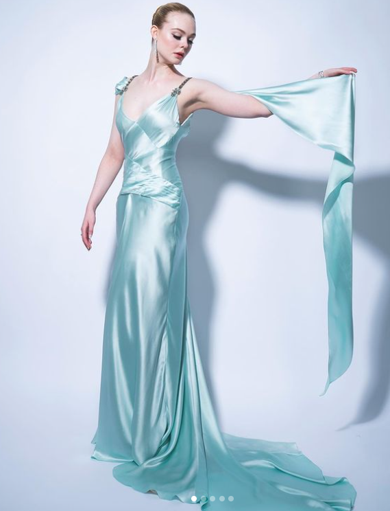 Elle Fanning, who has her first ever Golden Globes nomination in the Best Actress in a Musical or Comedy TV Series category for her work in The Great, dazzles in her ice blue custom Gucci gown: