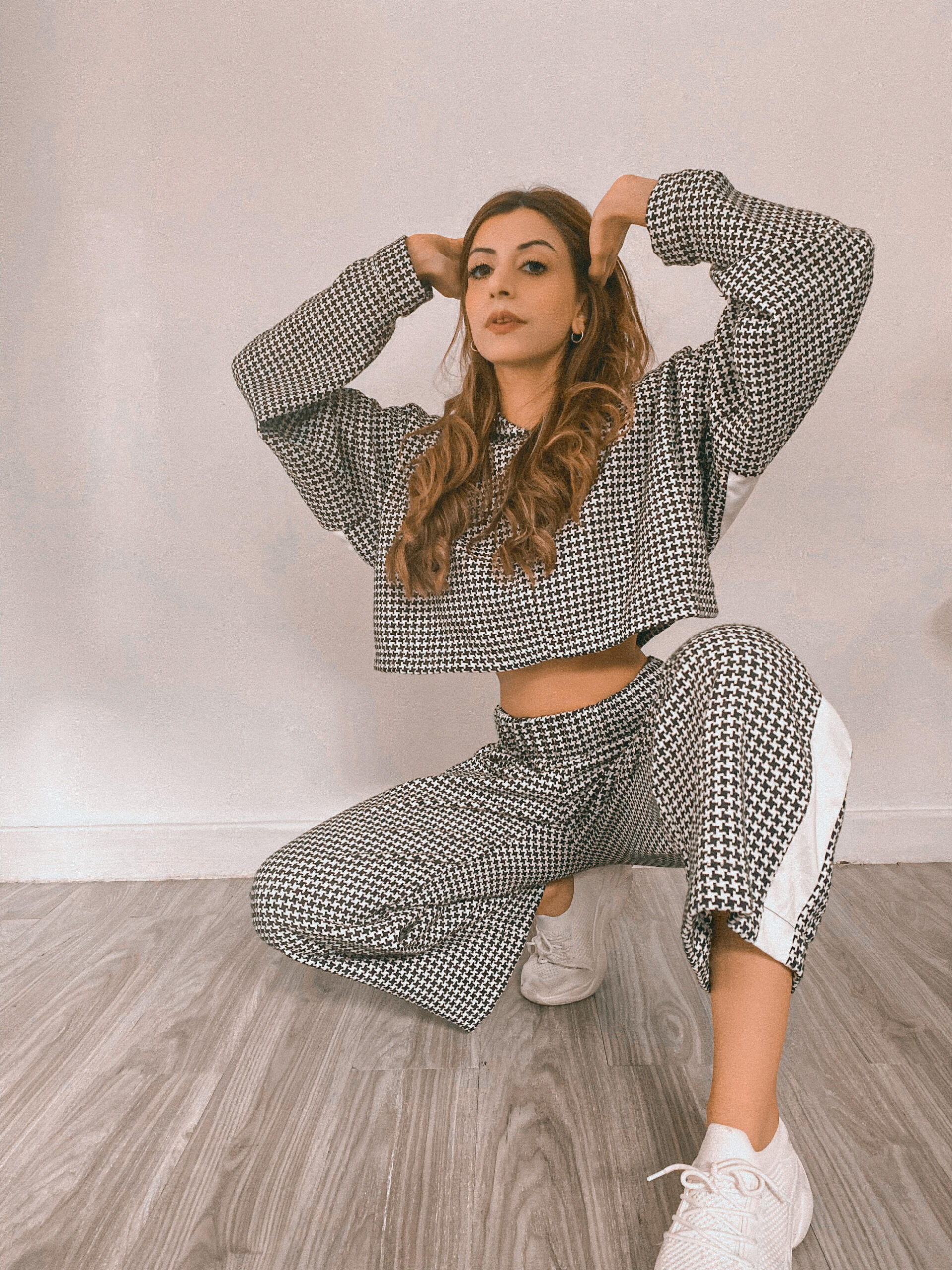 “This tracksuit features folded cuffs and sorta like a plaid, checkered pattern– which I think is unique. Very comfortable fit overall, and the top is sexy yet still classy. I paired this ensemble with sneakers for a street fashion vibe,” she said.