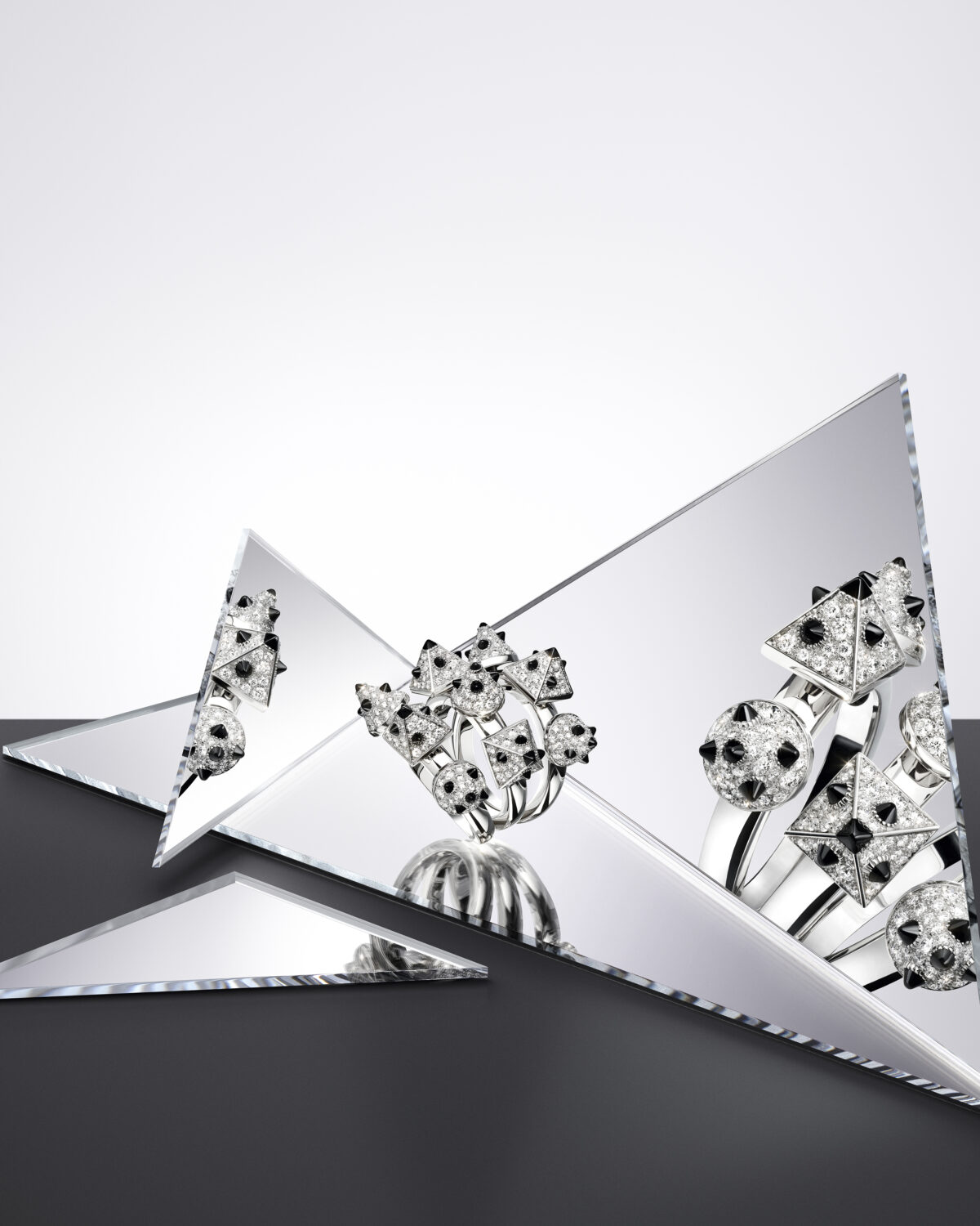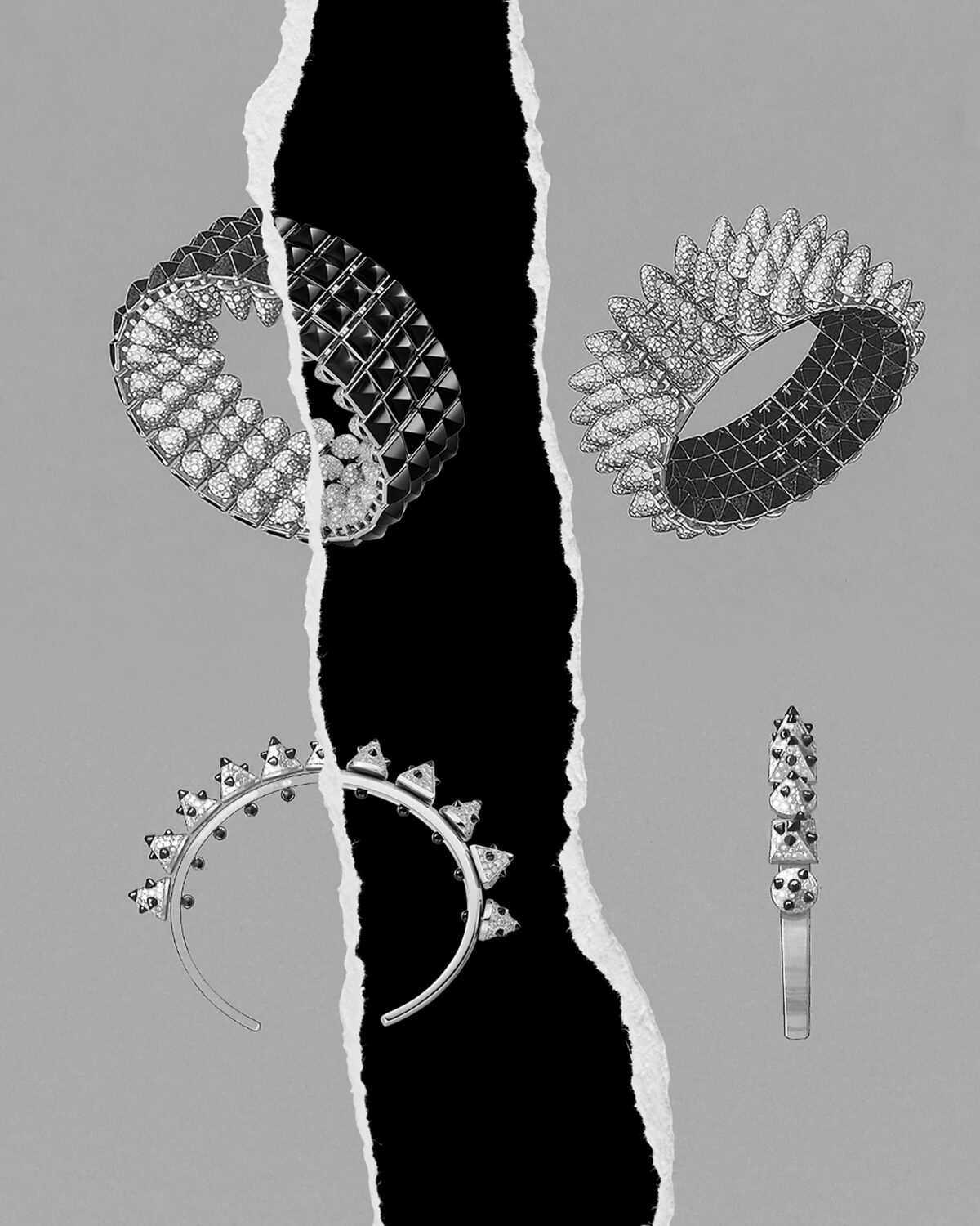 The exclusive limited edition jewelry pieces highlight the Clash de Cartier stud in excessive, spiky, and voluminous forms using a radical approach to precious jewelry in white and in black.