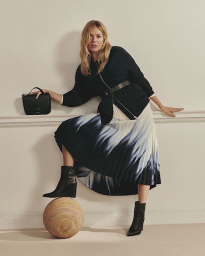 Outerwear and smart tailoring pieces (including Sienna’s favorite piece – the tweed blazer) sit alongside separates, blending elements of British style with more bohemian and eclectic influences. Quirky and surprising styling tricks, texture and prints in the form of an ombre dress, are styled back with foundation pieces such as tailoring and denim – a contemporary take on dressing, with a twist.