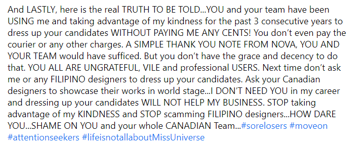 “Next time don’t ask me or any Filipino designers to dress up your candidates. Ask your Canadian designers to showcase their works in world stage,” he said. “I don’t need you in my career and dressing up your candidates will not help my business. Stop taking advantage of my kindness and stop scamming Filipino designers,” he added.