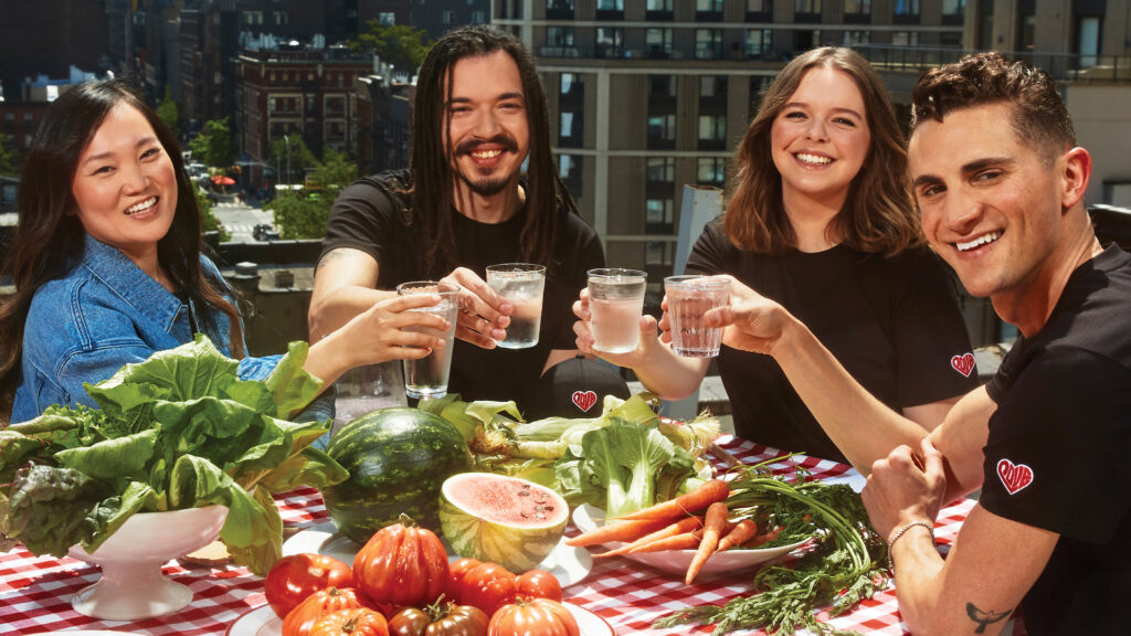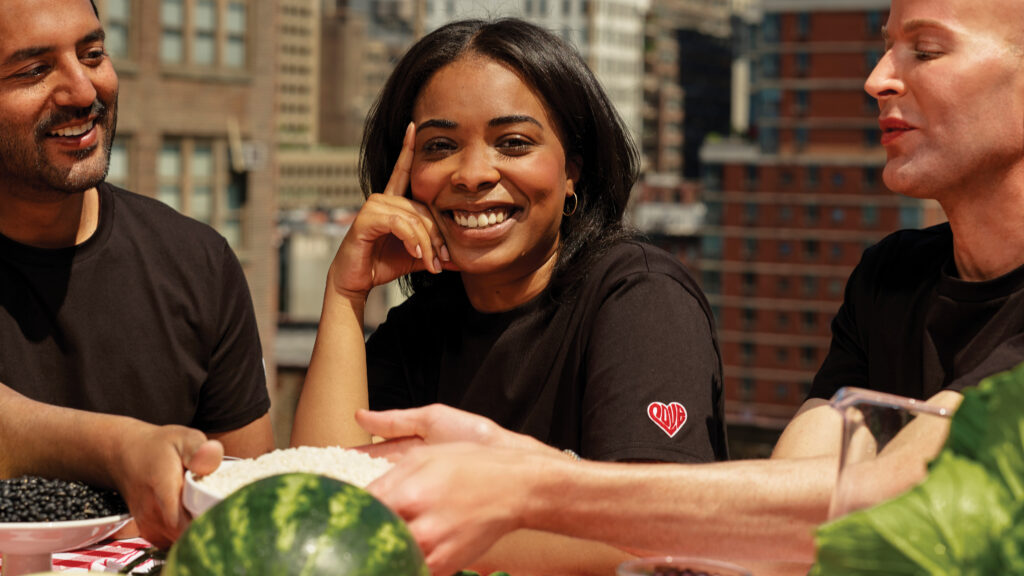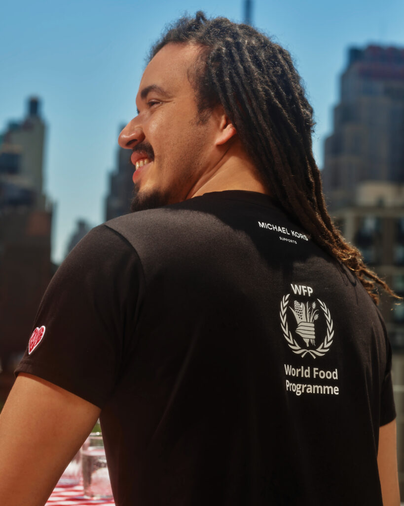 Shot by photographer Chelsea Kyle on a rooftop in New York City, the campaign imagery features the cast gathered around picnic tables, preparing to share a meal. With the city skyline in the background, the images reflect the joy in coming together for an important cause after a year spent apart. The staffers are pictured wearing the special-edition Watch Hunger Stop 2021 designs: a black, 100% organic cotton LOVE T-shirt, $40; a black hat, $68; and a black face mask, $24. All three are adorned with a red LOVE heart patch and the WFP logo. All profits from the sale of the tee, hat and mask go to WFP.