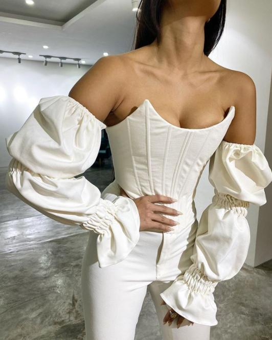 It beautifully highlights this caramel-colored bodysuit with pearls by Kelvin Morales: