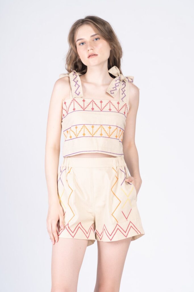 The Dahlia Set of PIOPIO is made of linen set with T’boli embroidery. This easy-on-the-eyes ensemble comes with the artistry of T’boli, the indigenous people of South Cotabato in Southern Mindanao.