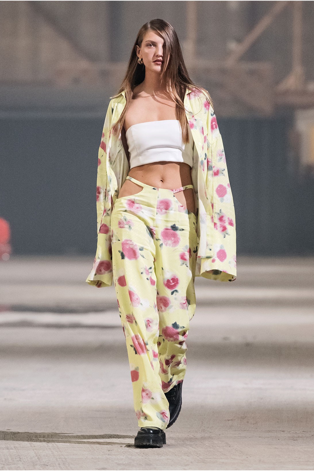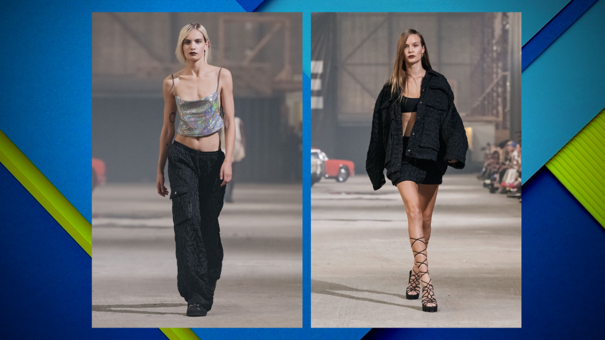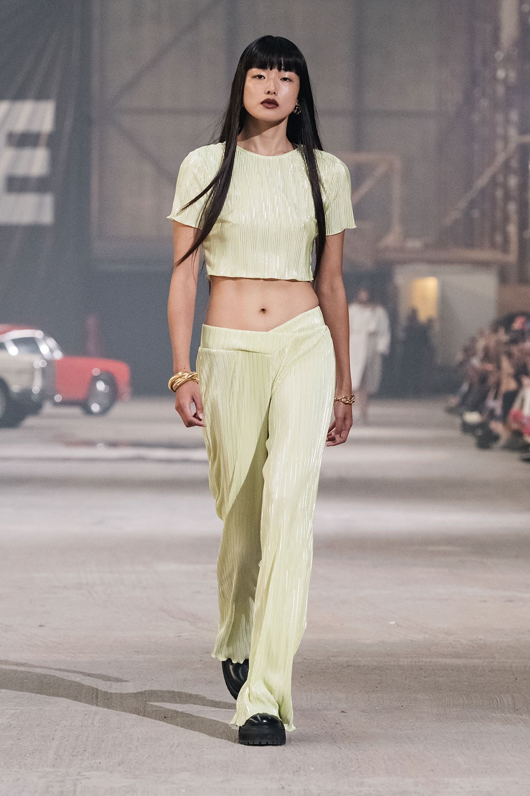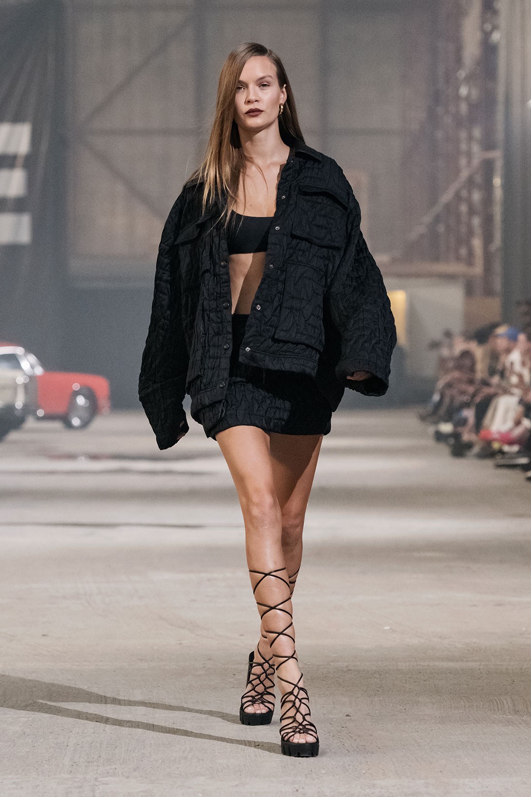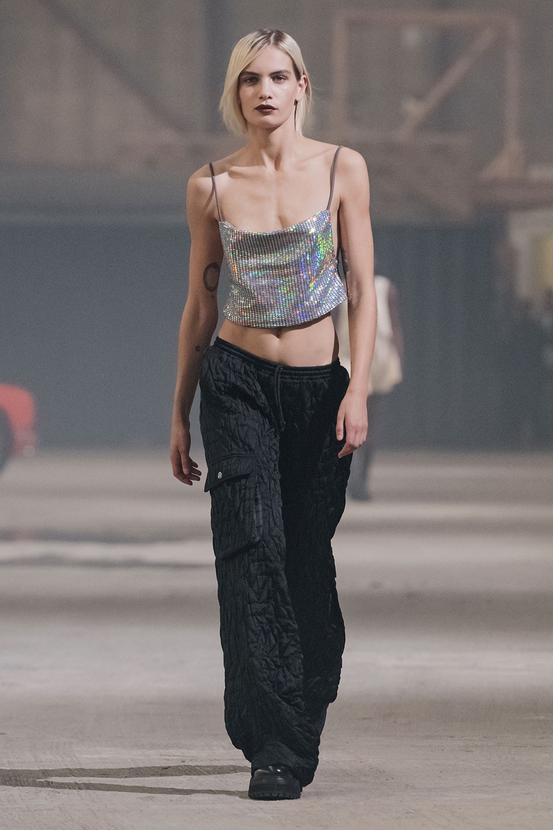 Creative directors Jeanette Madsen and Thora Valdimars took inspiration from the iconic ’90s TV sitcom character Frane Fine played by Fran Drescher on The Nanny. The spacious runway show venue was adorned with vintage sports cars, which made for a perfect backdrop for mini dresses paired with boots and strappy sandals, sequined tops matched with baggy low-cut pants, and furry bandeau top and glossy leather pants.