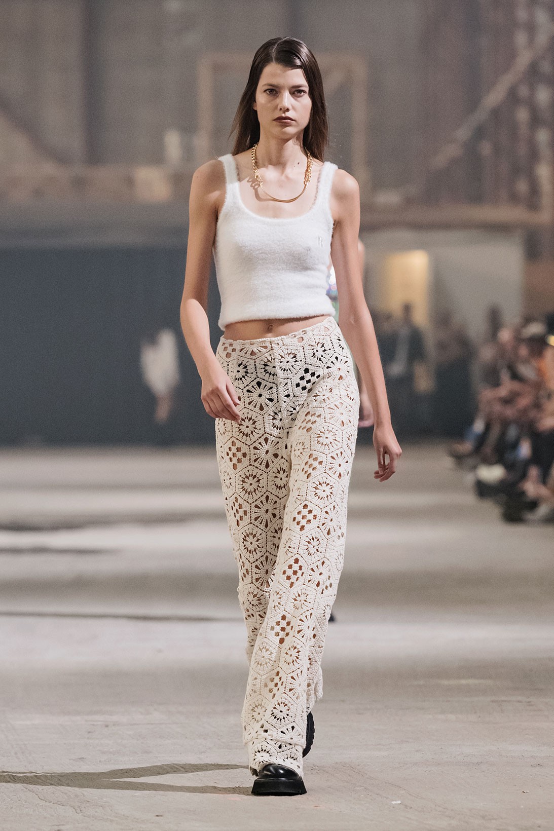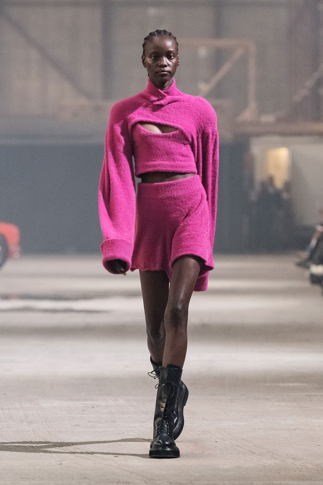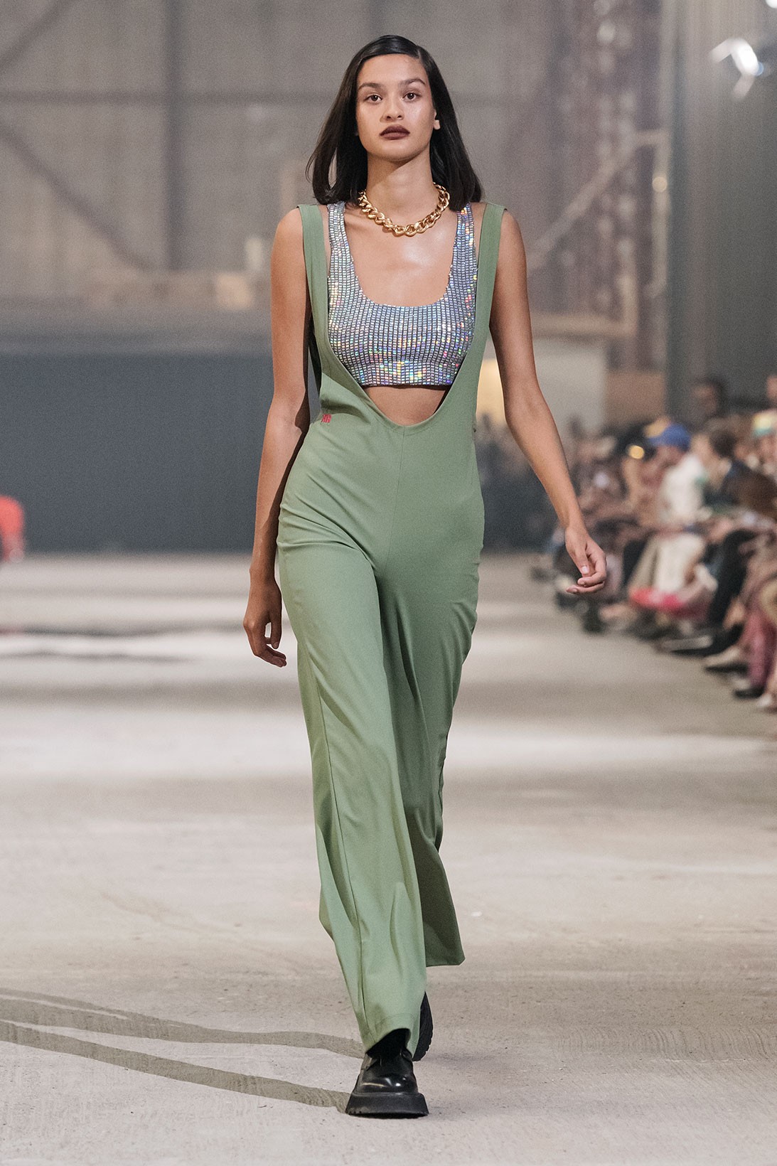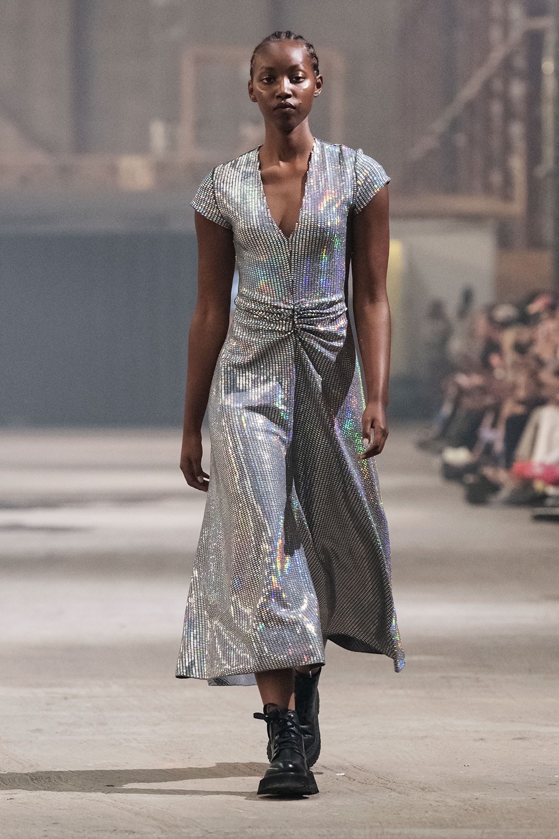 Creative directors Jeanette Madsen and Thora Valdimars took inspiration from the iconic ’90s TV sitcom character Frane Fine played by Fran Drescher on The Nanny. The spacious runway show venue was adorned with vintage sports cars, which made for a perfect backdrop for mini dresses paired with boots and strappy sandals, sequined tops matched with baggy low-cut pants, and furry bandeau top and glossy leather pants.