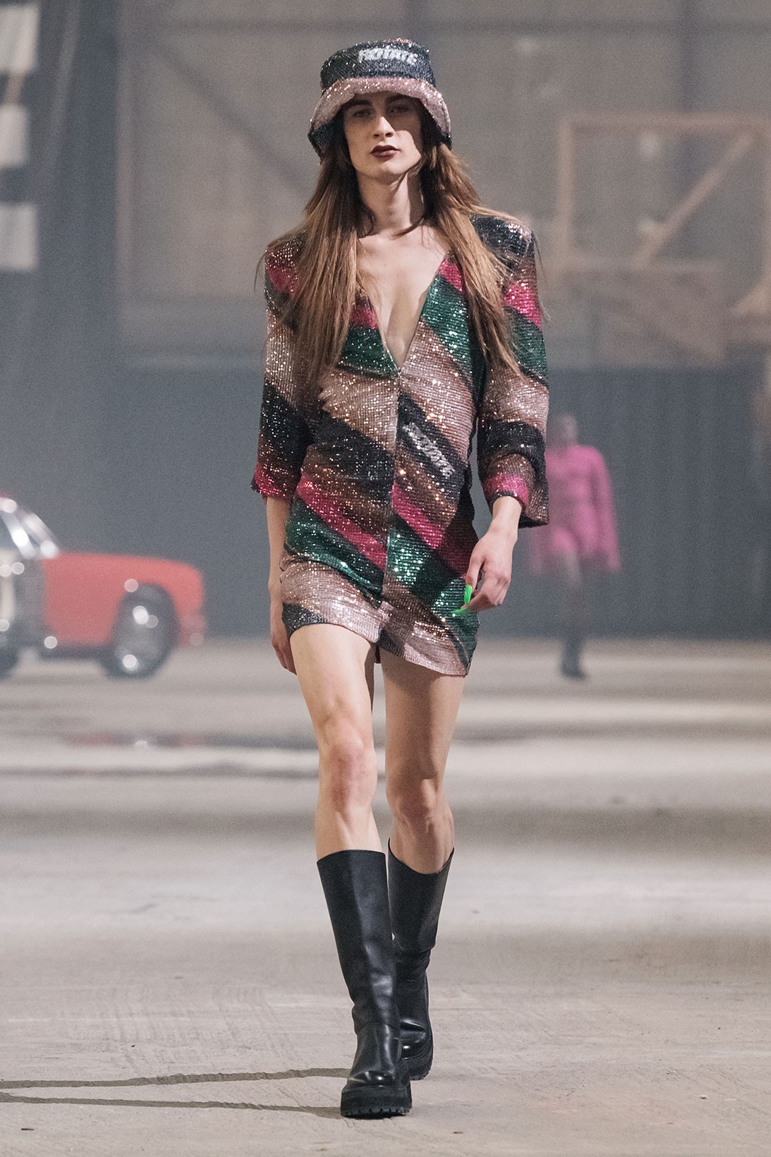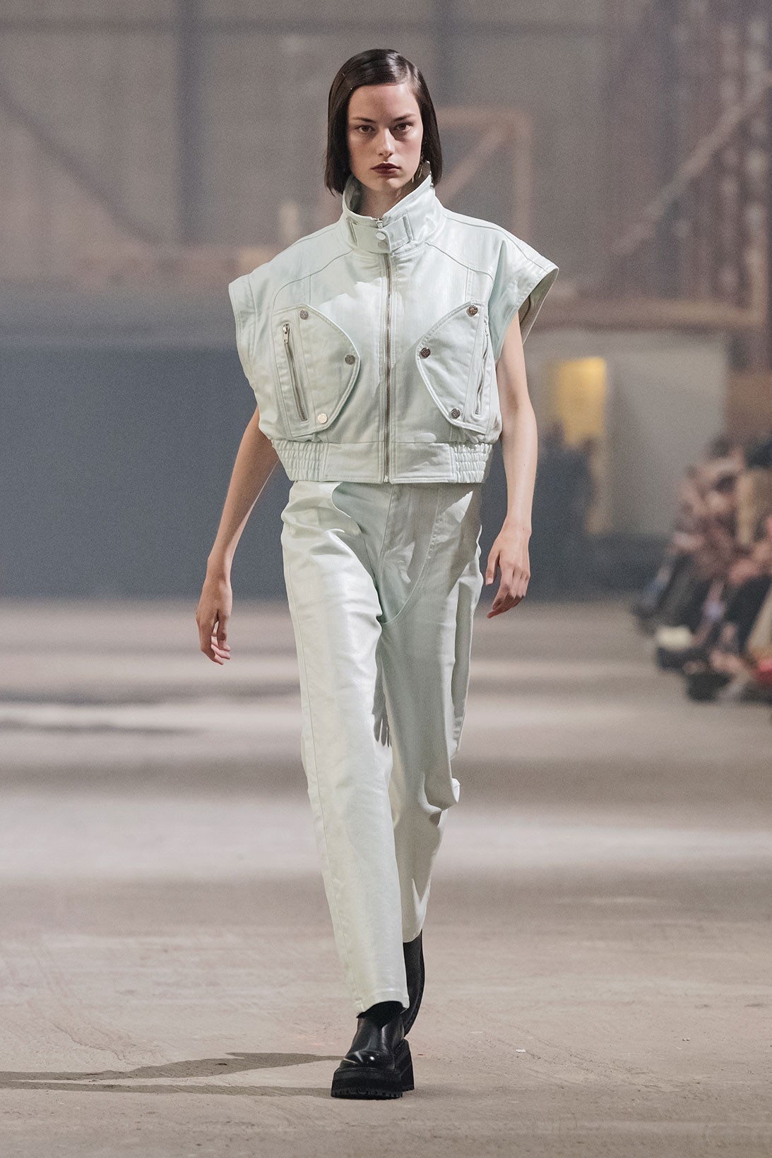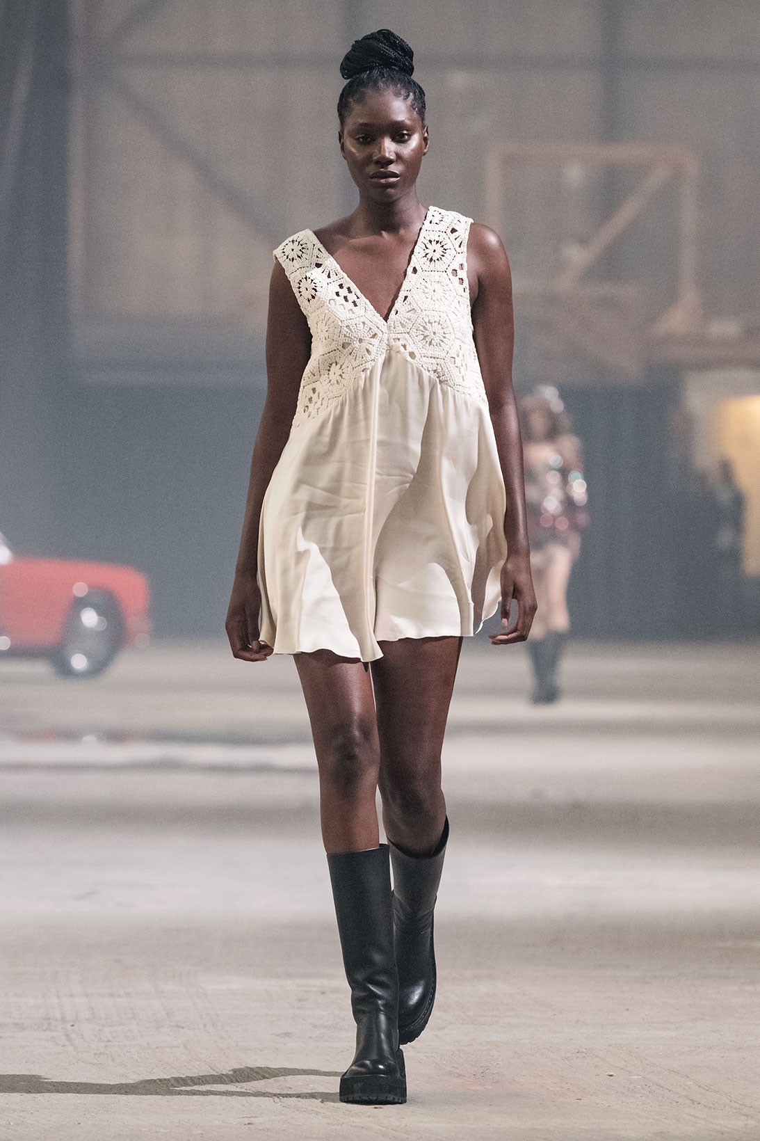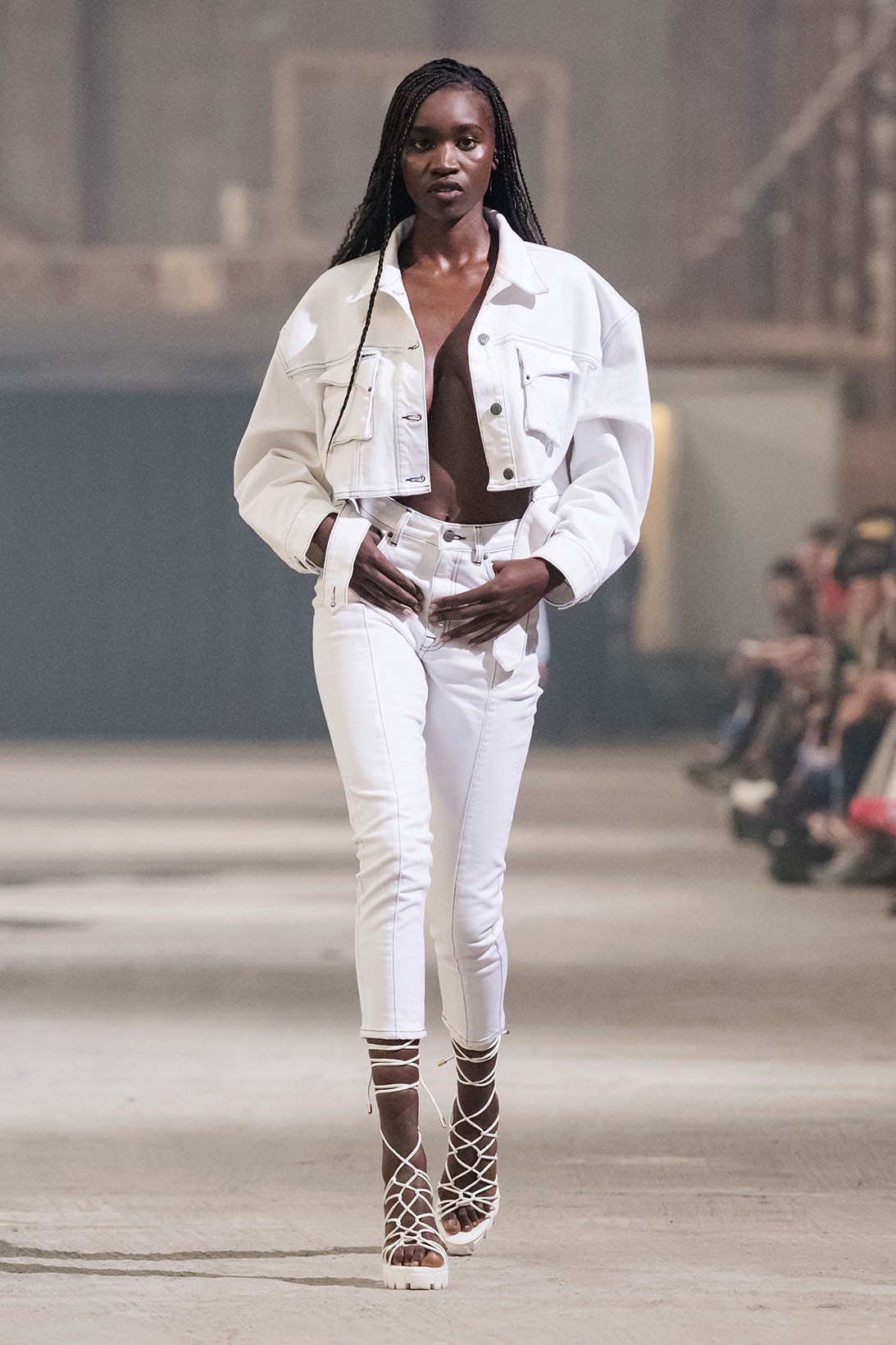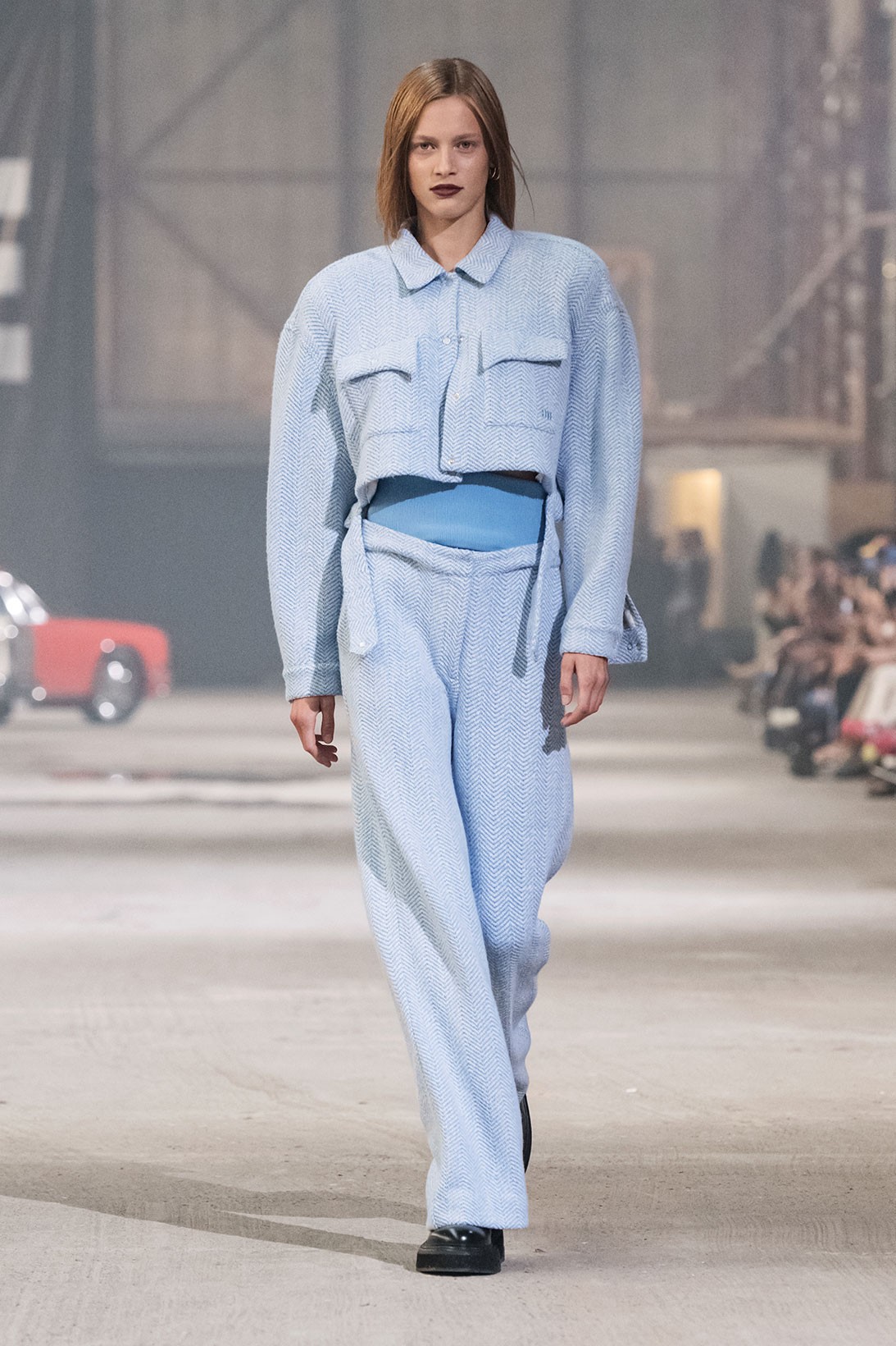 Creative directors Jeanette Madsen and Thora Valdimars took inspiration from the iconic ’90s TV sitcom character Frane Fine played by Fran Drescher on The Nanny. The spacious runway show venue was adorned with vintage sports cars, which made for a perfect backdrop for mini dresses paired with boots and strappy sandals, sequined tops matched with baggy low-cut pants, and furry bandeau top and glossy leather pants.