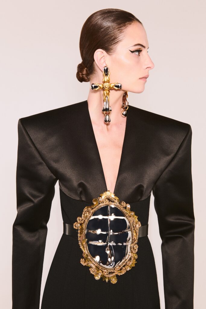 Most of the pieces have metallic fixtures and embroidery. “I loved the irreverence, and doing this season with embroidery what we did last season with the jewelry,” Roseberry said in an interview.