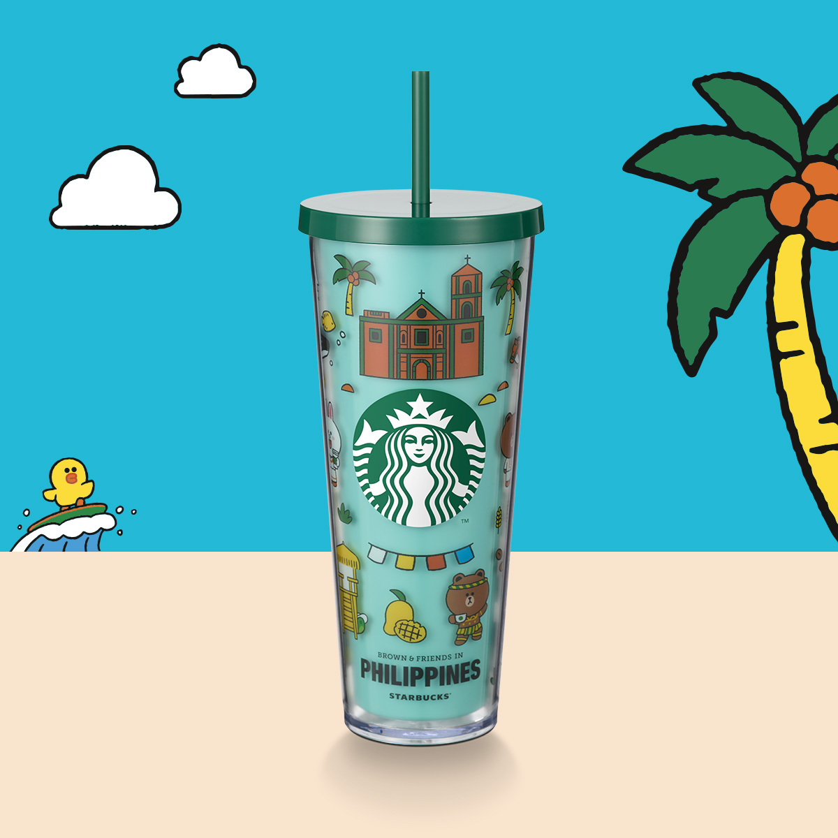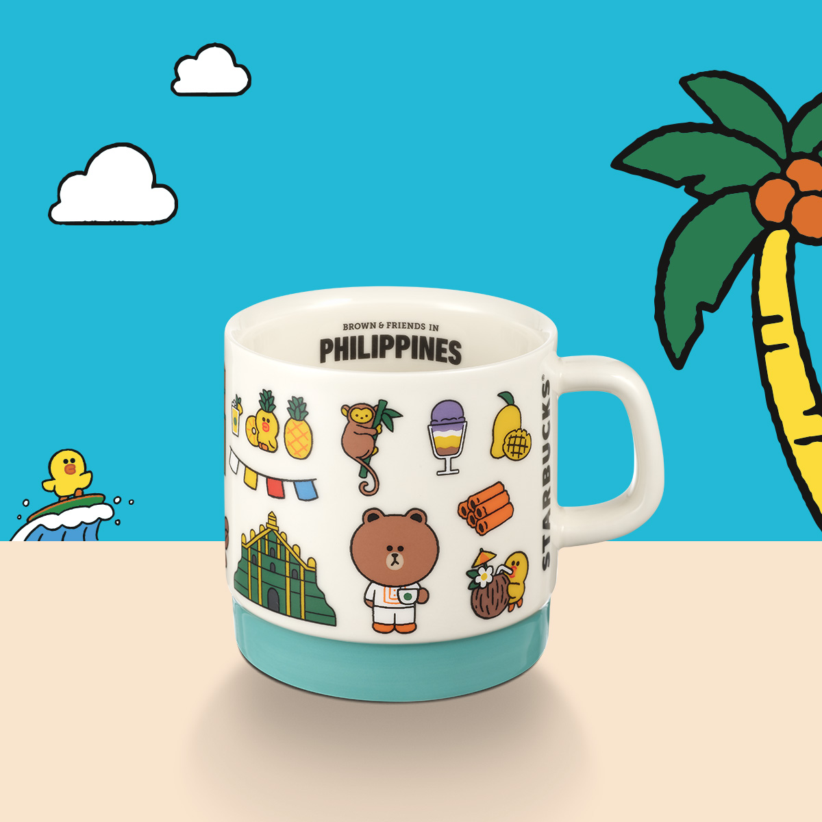 The art design of the Starbucks mug & tumblers is truly Filipino — with a showcase of Line Friends character Brown enjoying fave Pinoy snacks such as lumpia, halo-halo, mangoes, pineapples and coconut juice. And you can see the famous Philippine tarsier too, as well as a Catholic church, the traditional barangay fiesta banderitas, bahay-kubo and of course, the famous Pinoy jeep!