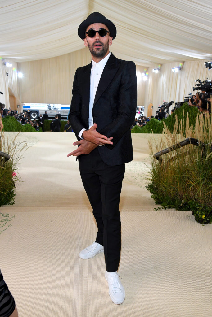 French artist JR wore a Gucci black floral jacquard two button satin peak lapel evening jacket with a white evening shirt, black wool mohair pants and white leather Ace sneakers with perforated Interlocking G detail.