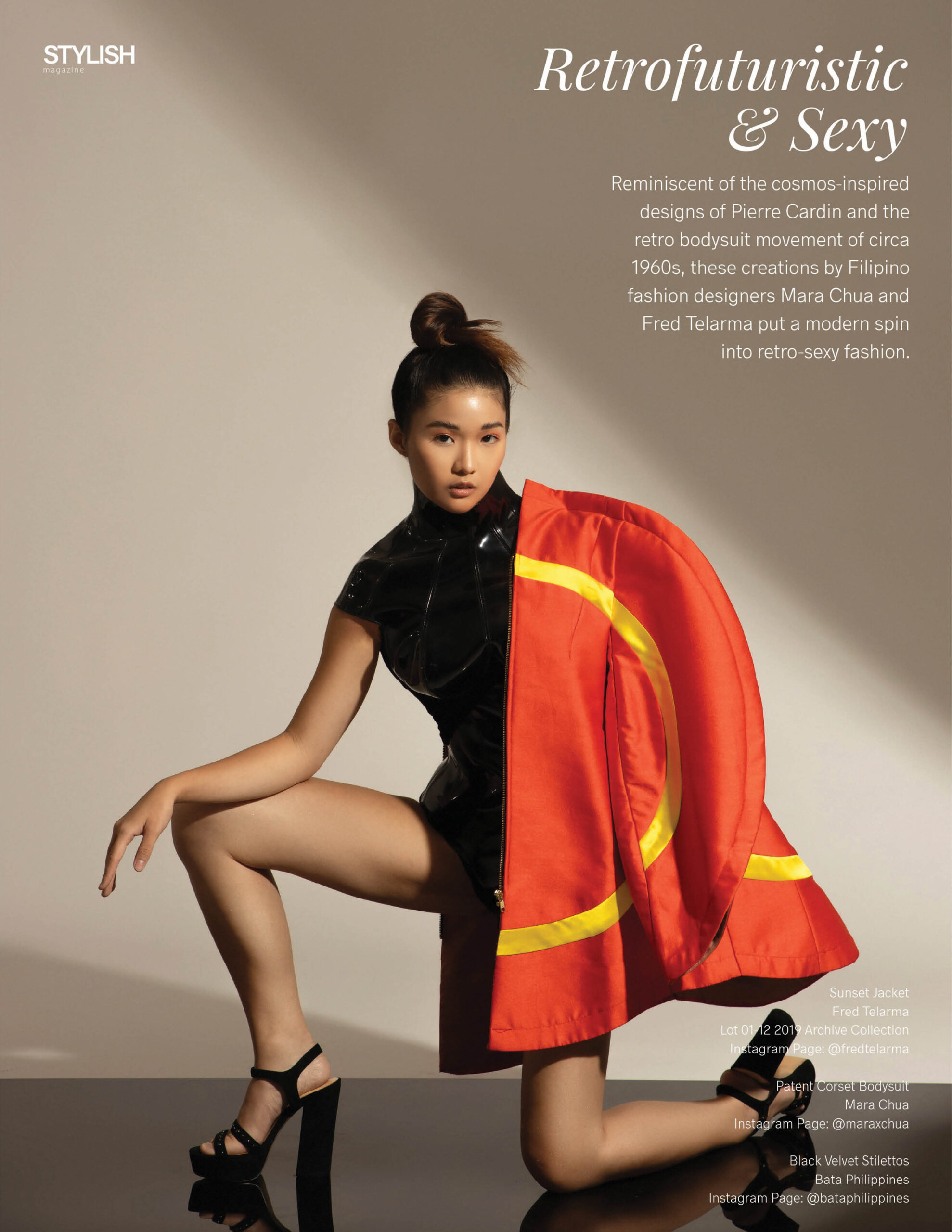 For our Stylish Magazine’s current special edition dubbed as The Beauty Issue, I’ve pulled out a couple of my personal Fred Telarma favorites. One is from Fred’s Lot 01-12 Collection, which I personally saw being launched on the Panasonic Manila Fashion Festival pre-pandemic. It’s the orange sun jacket made of hablon fabric from Iloilo. I love that a Filipino indigenous fabric is being used, plus the jacket is very much reminiscent of Pierre Cardin‘s retrofuturistic aesthetic in the ’60s, which defined the Space-Age Fashion in that decade. Space-Age Fashion of the ’60s is the main theme of what we’re going for in the ish fashion-wise.