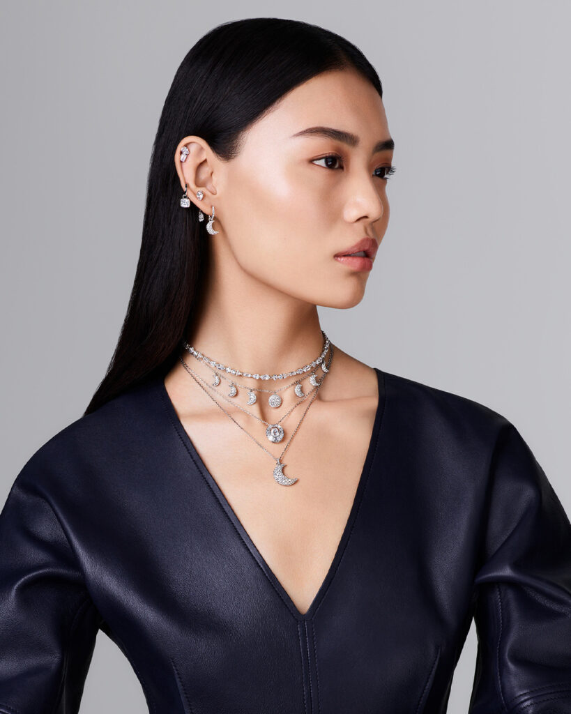 Energetic. Mysterious. Boldly alluring. Luna embraces the incomparable beauty of the Moon, transforming its crescent shape into an array of provocative jewelry pieces. Designs have a punk edge glittering with complex pavé, sharp angles, and radiant spheres.