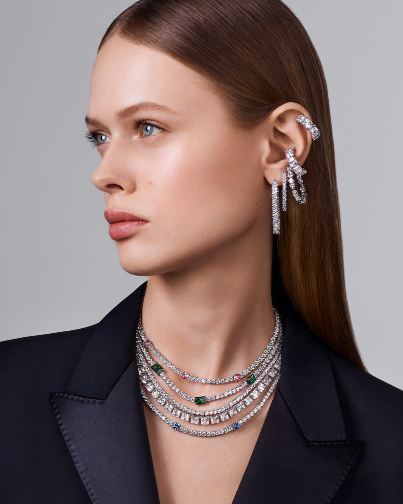 Matrix designs are in constant flow. The strands of clear and colored crystals seem almost endless, blazing an impeccable trail of sophistication and luxury for the holiday season.