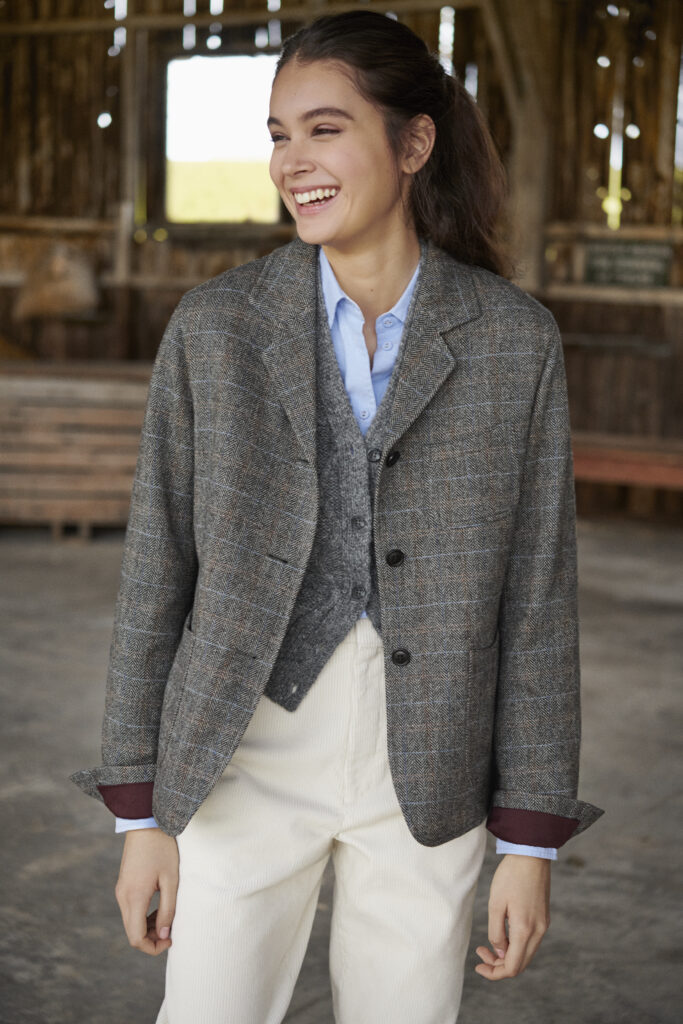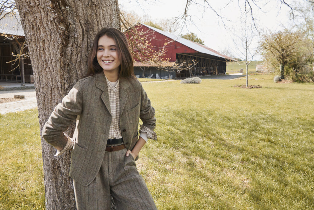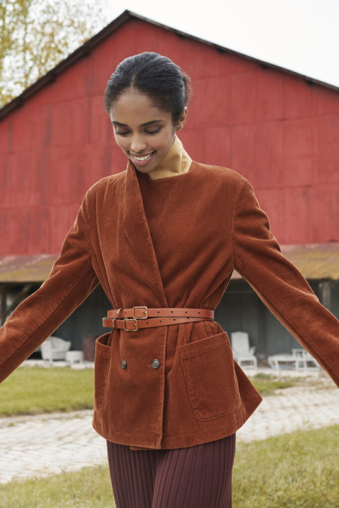 The soul of “something inherited and passed on to the future” flows gracefully through this collection, embodying Ines’ vision for people to embrace simple, durable, and elegant attire that carries authentic and timeless values. Notable examples include cozy pointelle knits and voluminous sleeve blouses that epitomize this spirit. Traditional shirts receive a touch of hand-finished stitching that exudes authenticity. The assortment also features sheer shirts and velvet long skirts, skillfully reimagined with contemporary updates. Embracing modernity, form-fitting 3D knits and padded shirt jackets grace the collection.