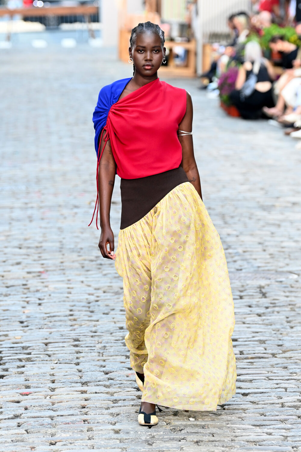 The collection’s palettes are joyful, unexpected combinations of red, fuchsia, lavender, blue, green and chartreuse–bold and bright color mixes that you wouldn’t normally put together, but that work. The fabrication is about pieces that feel comfortable to wear, in mixes of humble and luxury materials: silk chiffon with linen burlap or broderie anglaise, cotton poplin with matte jersey, as well as tech knit with silk dupioni. Crepe jersey drapes beautifully on long skirts and dresses, while some feature textures in the forms of embroidery, topstitching, and ruching: