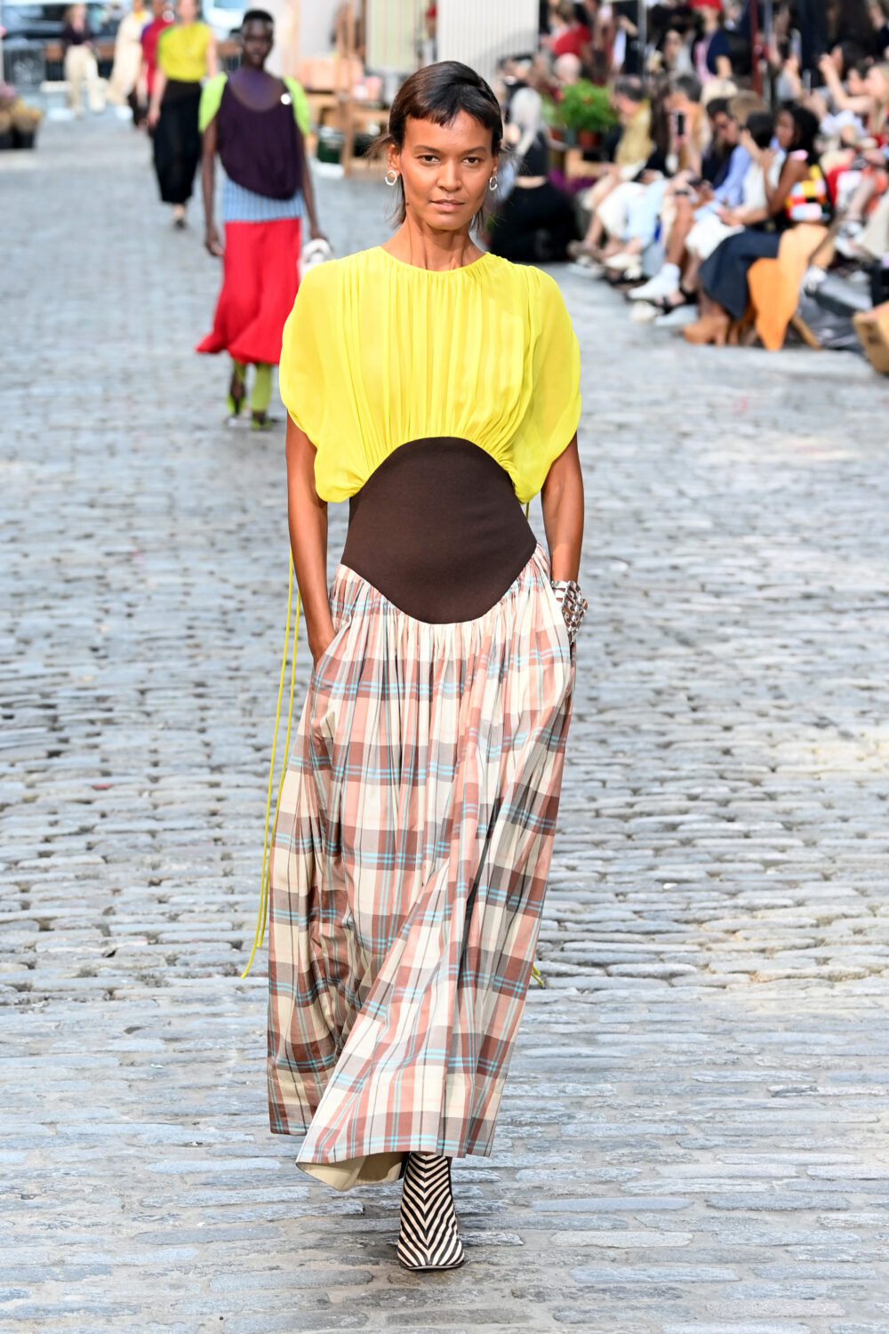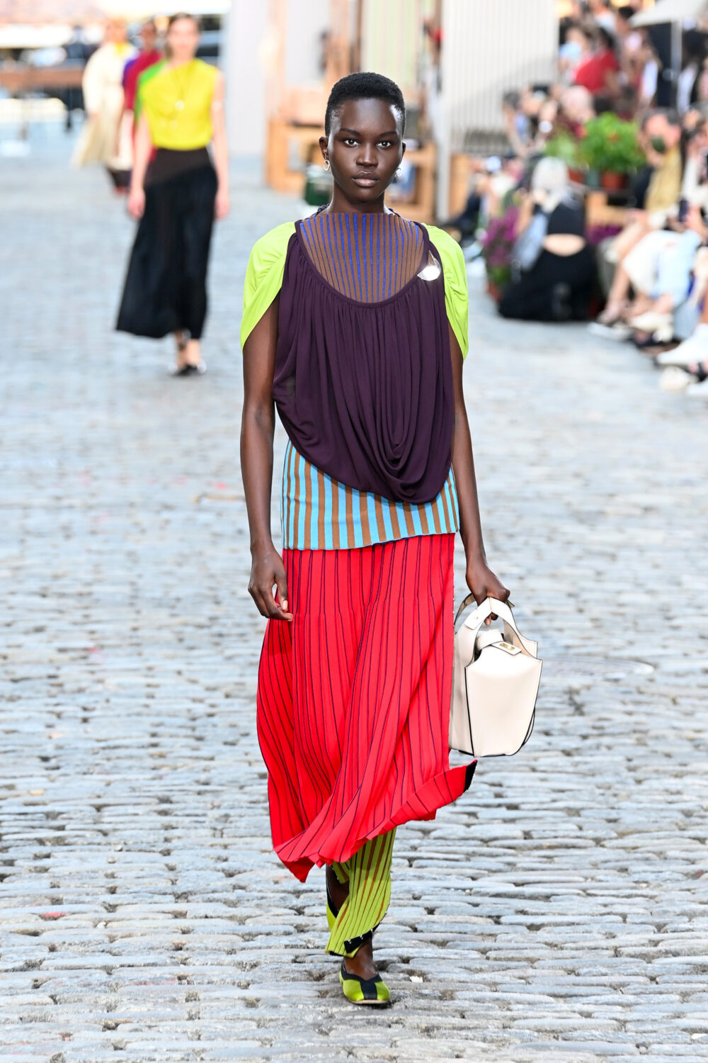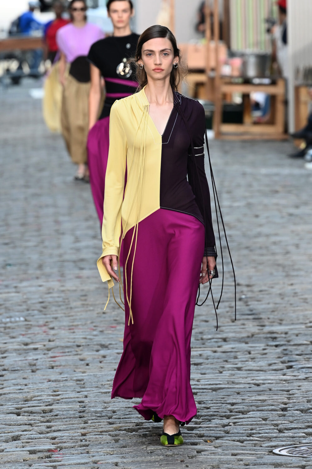 The season reflects these then-radical ideas with a mix of versatility, function, integrity and joy. There are striking contrasts of colors, prints and fabrics. Waists are softly defined with broad belts, long sashes and tech-knit bandeaus, balanced by the proportion of full skirts and relaxed trousers.
