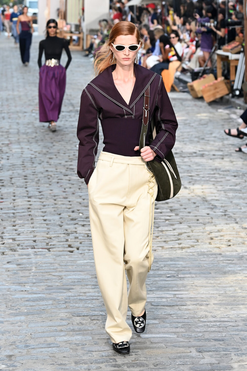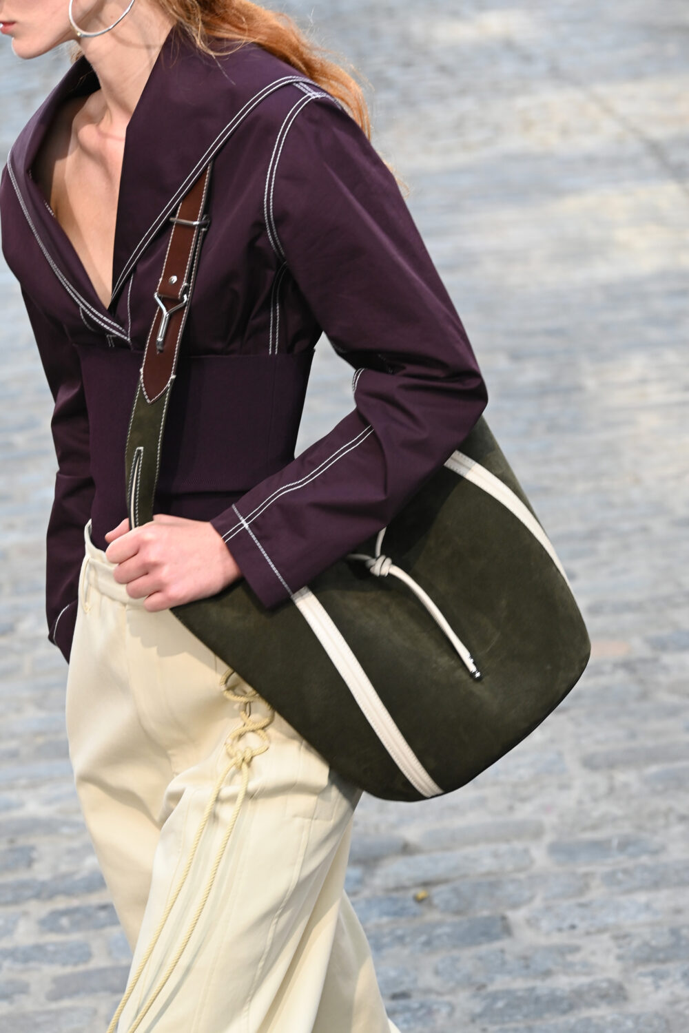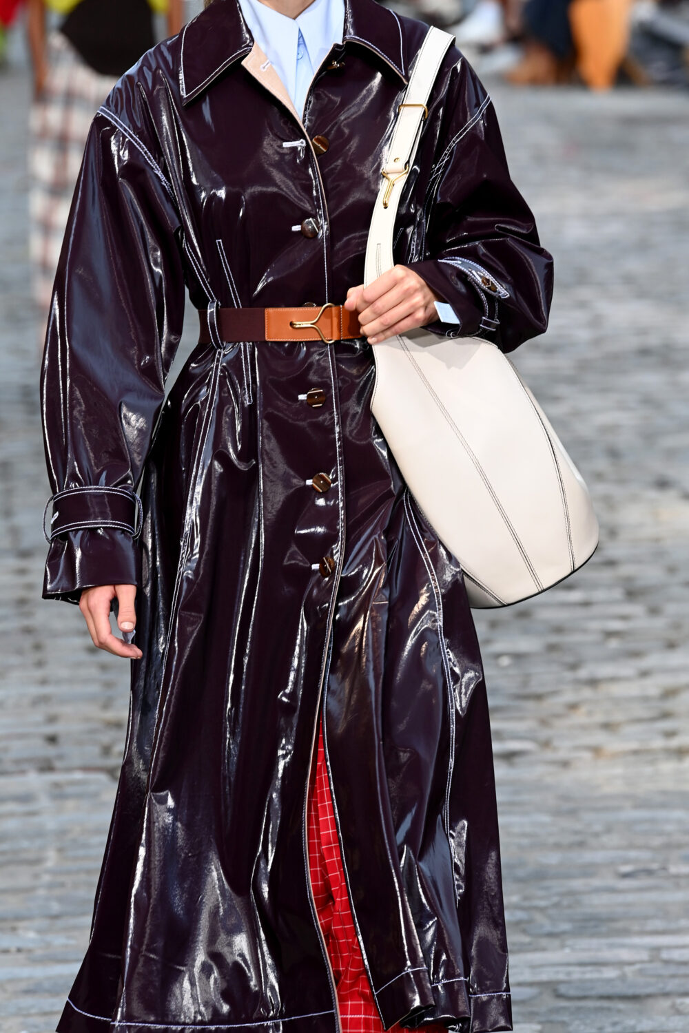 The collection’s accessories are impeccable too. Bags, shoes and jewelry continue the themes of function and versatility. Totes and hobos are crafted in raffia and double topstitched leather with hook-and-eye closures. Evening bags in linen and leather are worn for day, with long beads inspired by Bakelite on the straps. The Lampshade tote is featured too, which is the inverse of a 1950s-inspired lampshade hat.