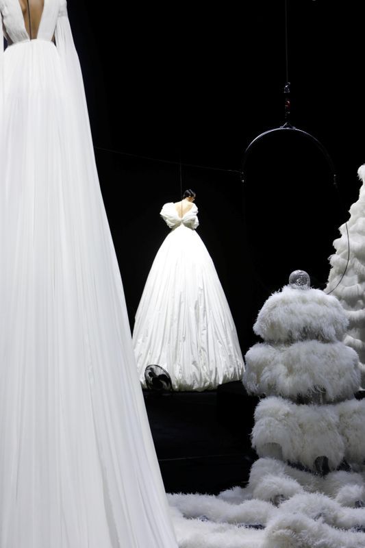 The fashion performance took its audience into the utopian imagination of the fashion house’s creative director since 2008: Pierpaolo Piccioli. The show had the models majestically floating in the air doing delicately choreographed movements against a pitch-black background– wearing resplendent long and flowing white couture gowns. Some were casually sitting, gloriously swaying in the air, others were standing, slightly dancing on majestic swings–as they all donned elaborate creations with ruffles, feathers, taffetta and chiffon details.