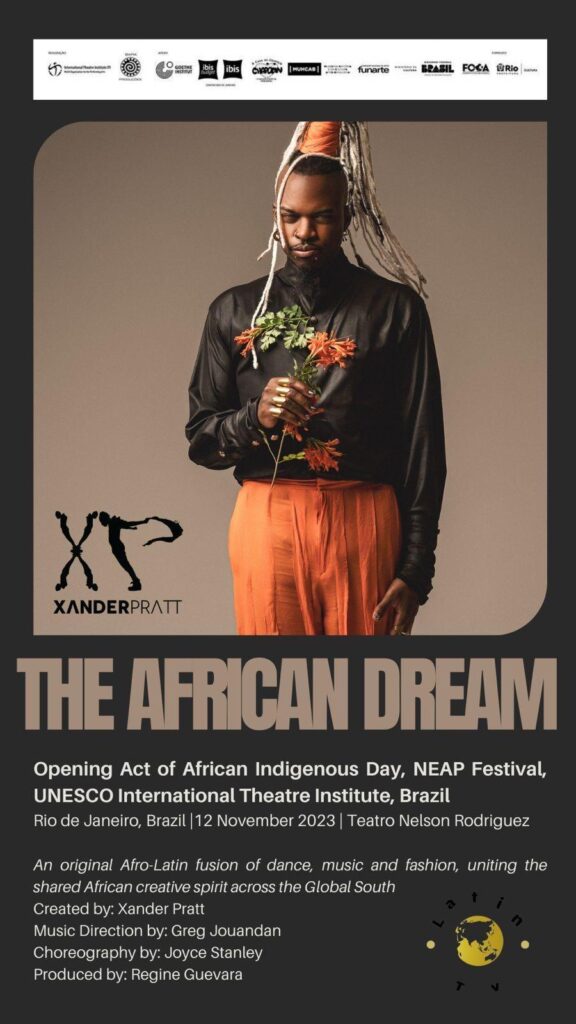 “Xander Pratt’s work shows the public different artistic manifestations through the combination of music, dance, clothing and performances. Thus creating, in “African Dream”, a space to celebrate the union and expression of these cultures, ultimately contributing to their preservation, dissemination and glimpse of their future,” said Guilherme Alves, an Afro-Latin dancer from Brazil under UNESCO-ITI, who will perform with XP in Brazil for The African Dream.